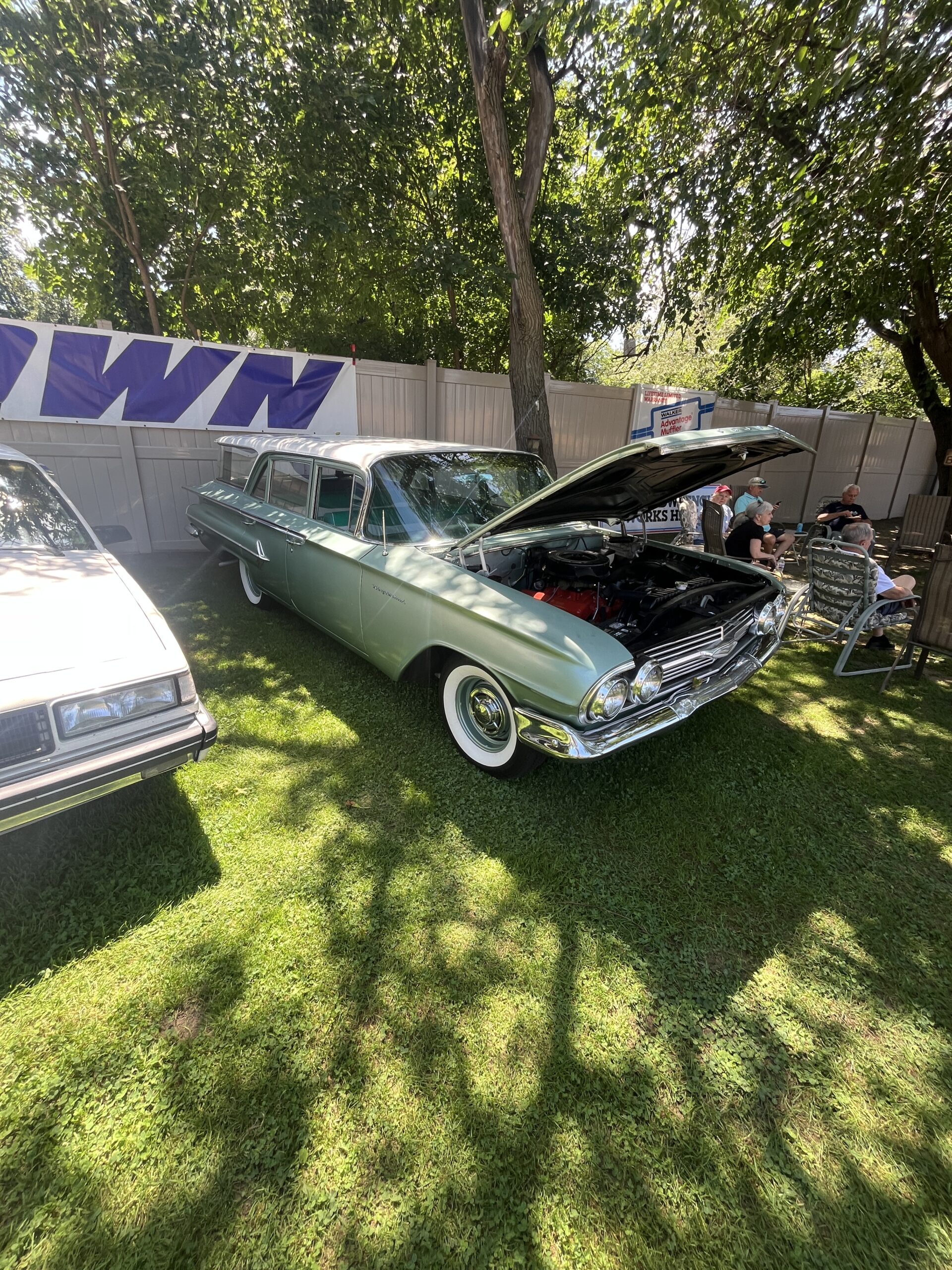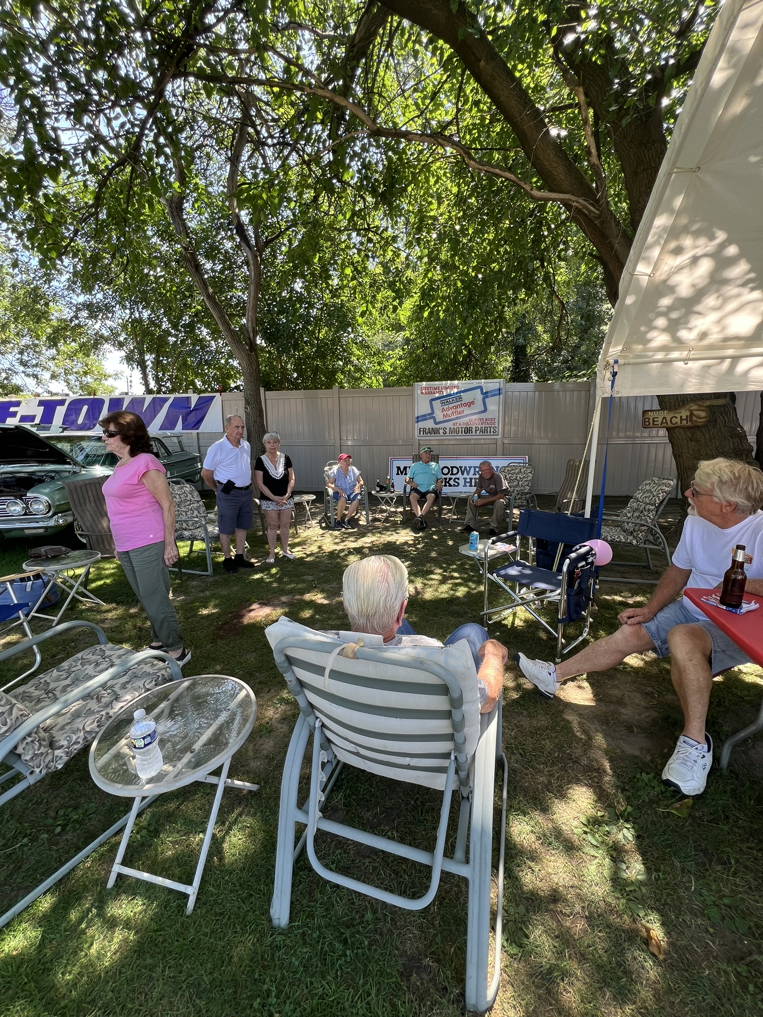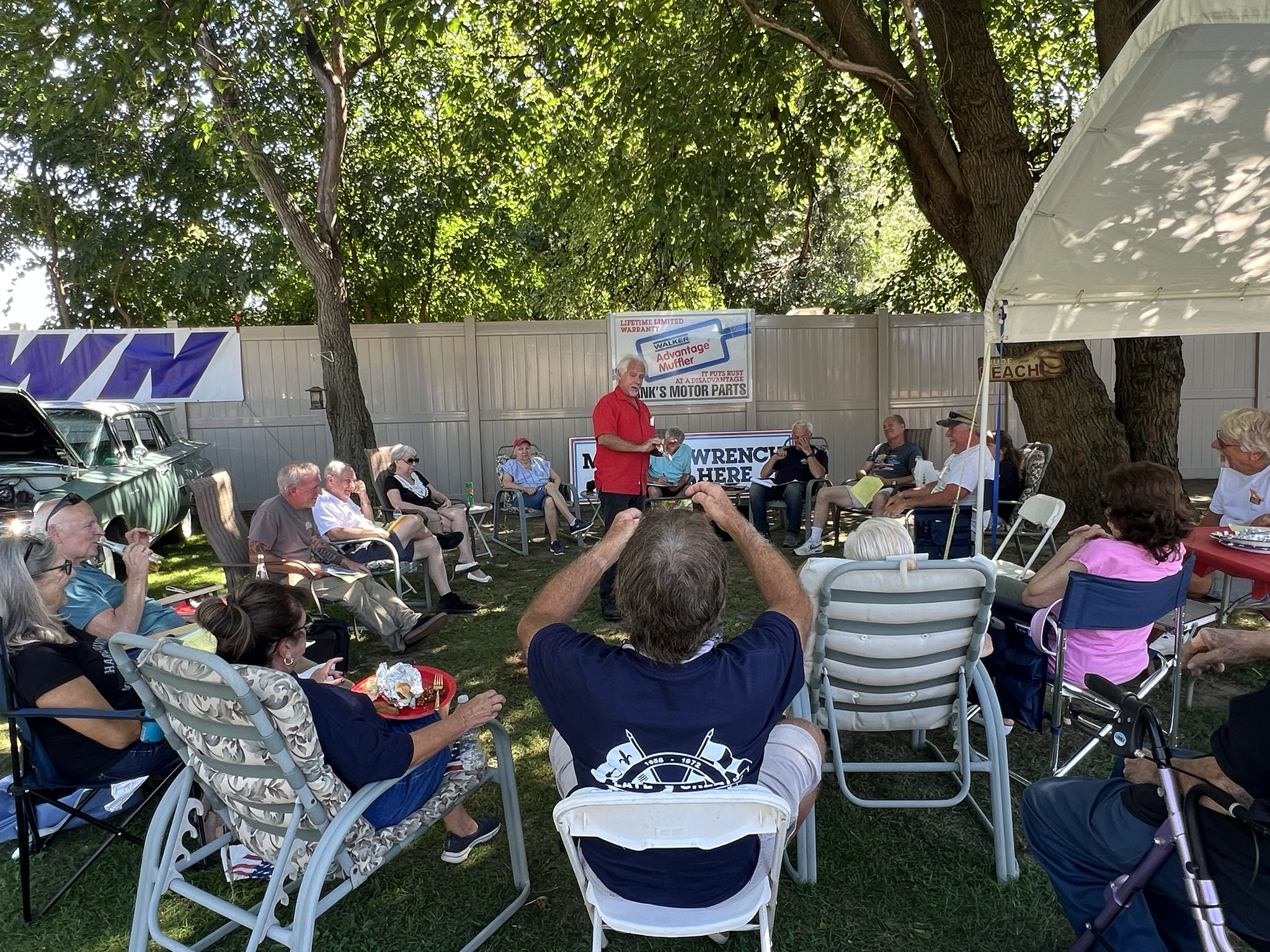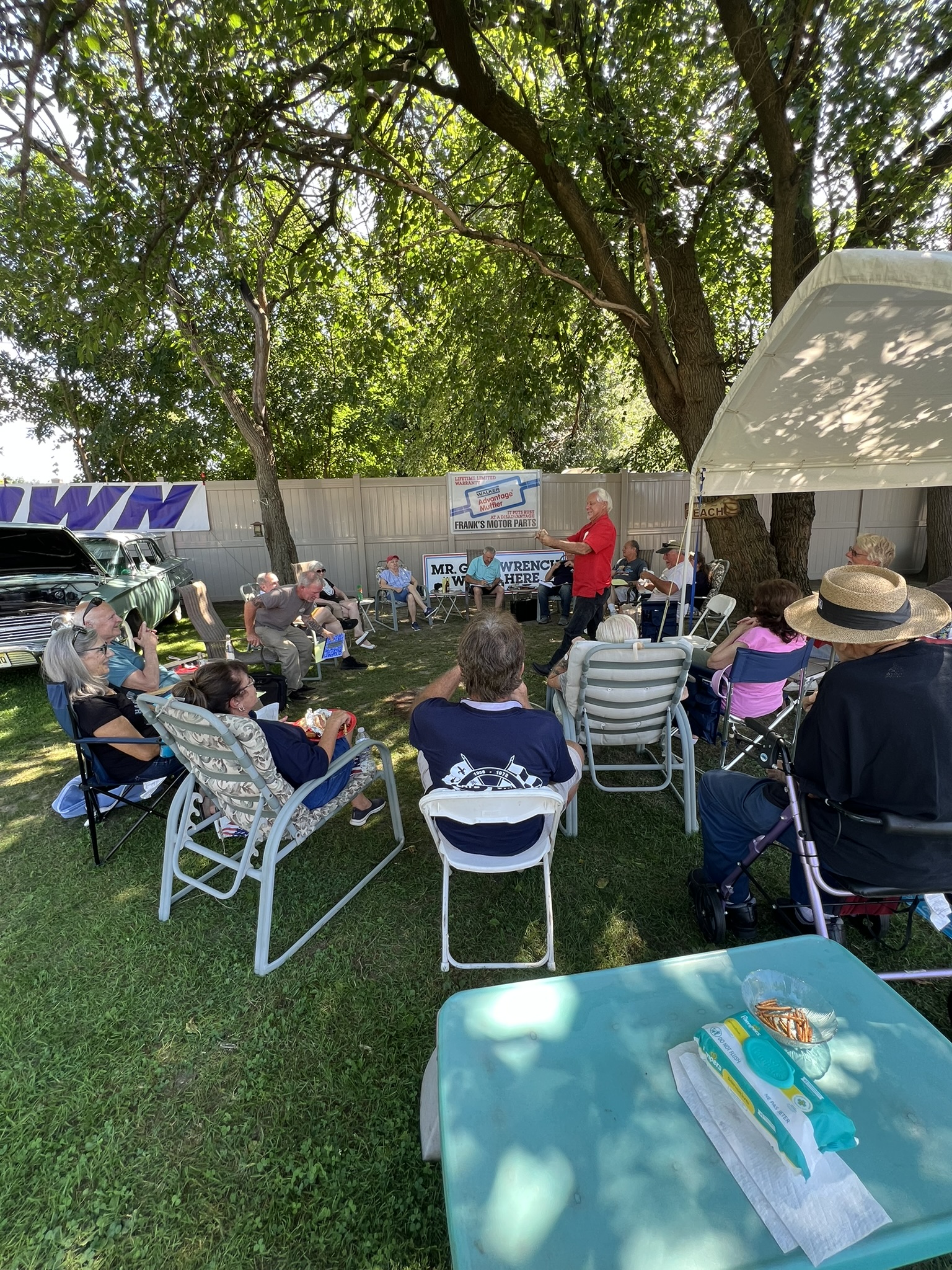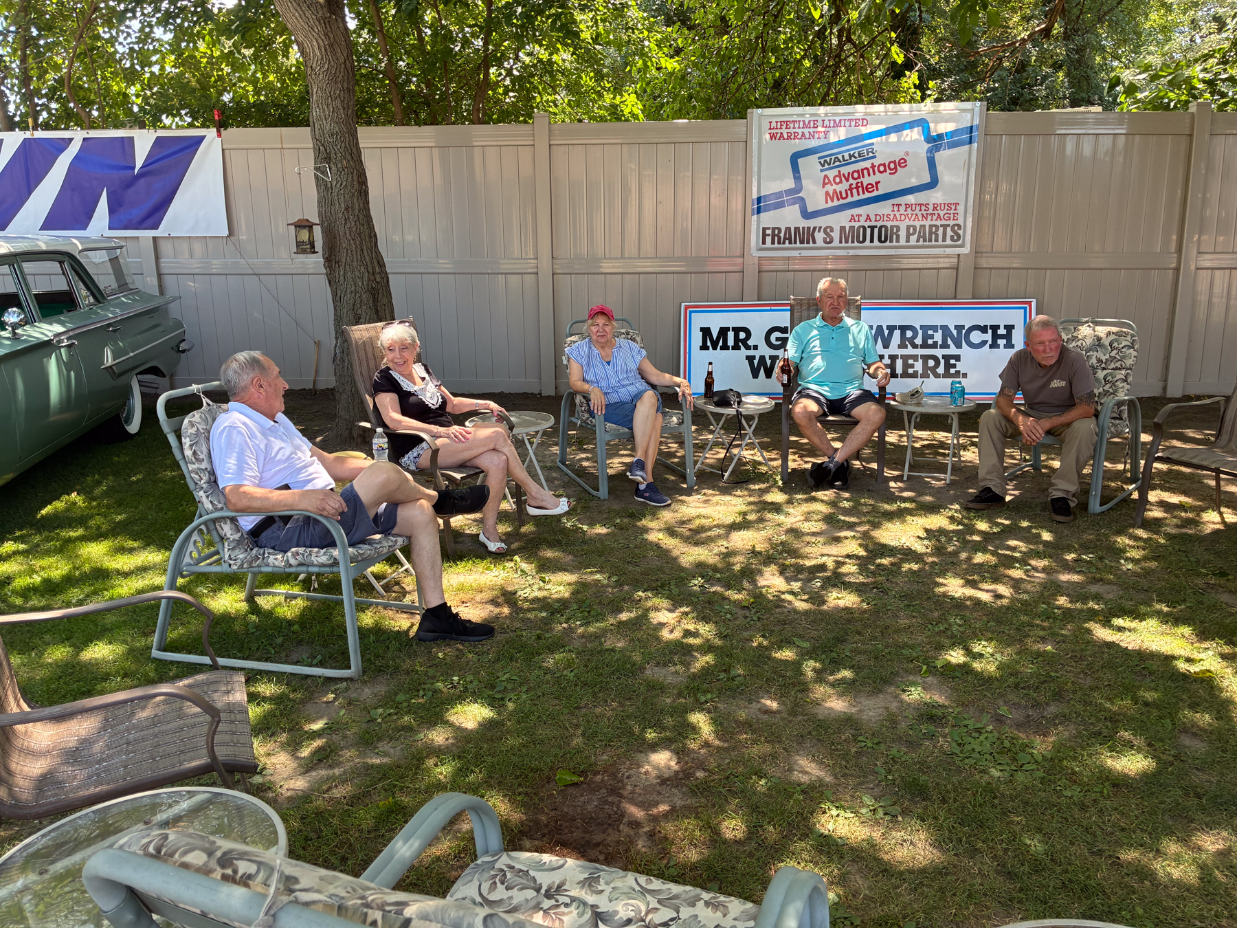 The Dennery Picnic was the Event of the Year! If you missed this picnic, you missed a great day. Dawn and John put on a truly excellent event once again. Their yard was decked out with auto related signs everywhere. (I wonder where they all came from?) Our club was joined by members of the VCCA (Vintage Chevrolet Club of America) Several in attendance are members of both clubs. It was fun seeing a number of cars I hadn’t seen before. One in particular, a robin’s egg blue 1953 BelAir convertible was amazing. There was plenty of food and drink, our own Steve Calandra spinning records and singing, a pool, nice shady seating areas and toward the end of the day, the dessert bar! I would like to thank Jason Dennery for handling the grill duties. Good Job!