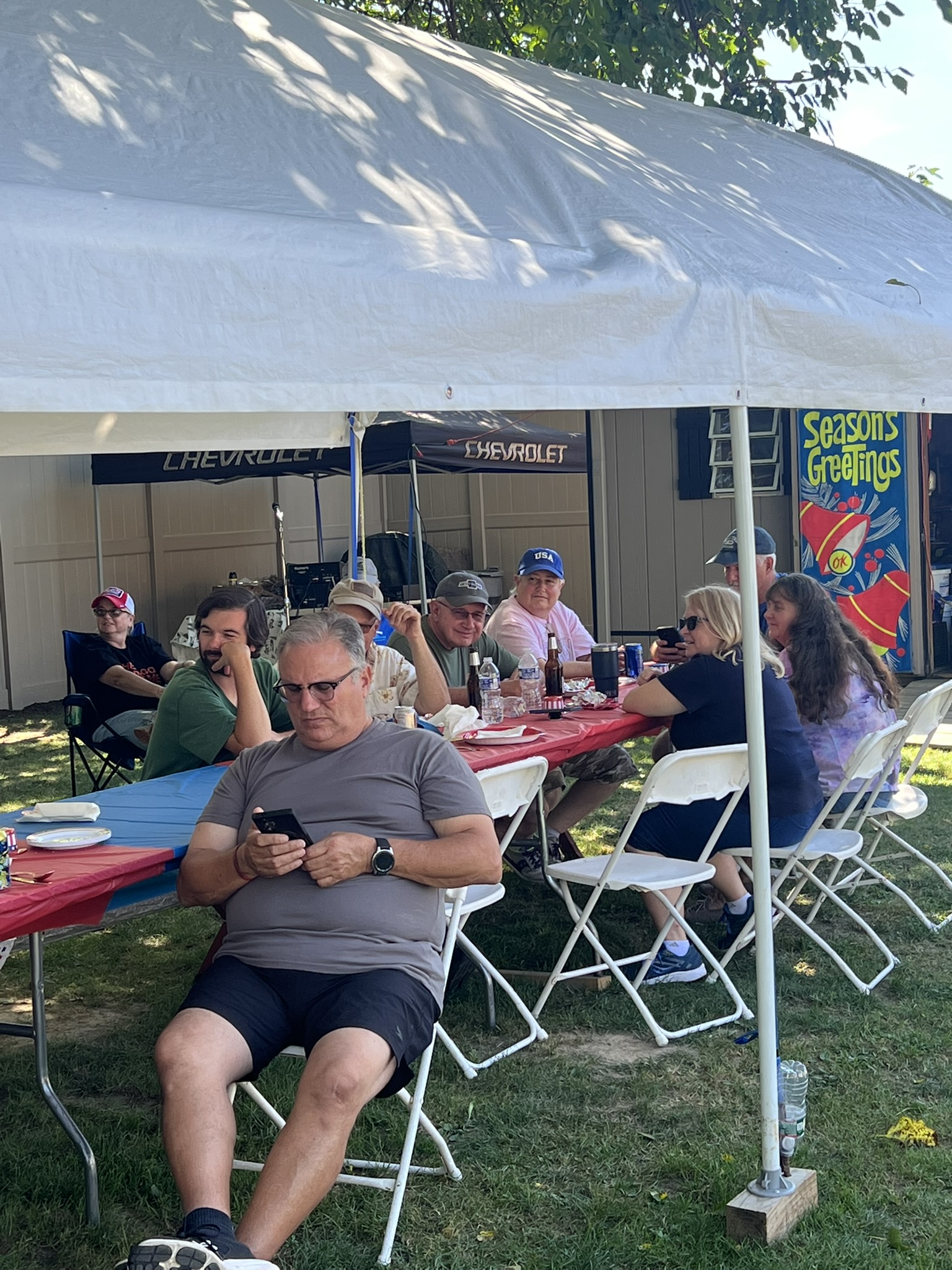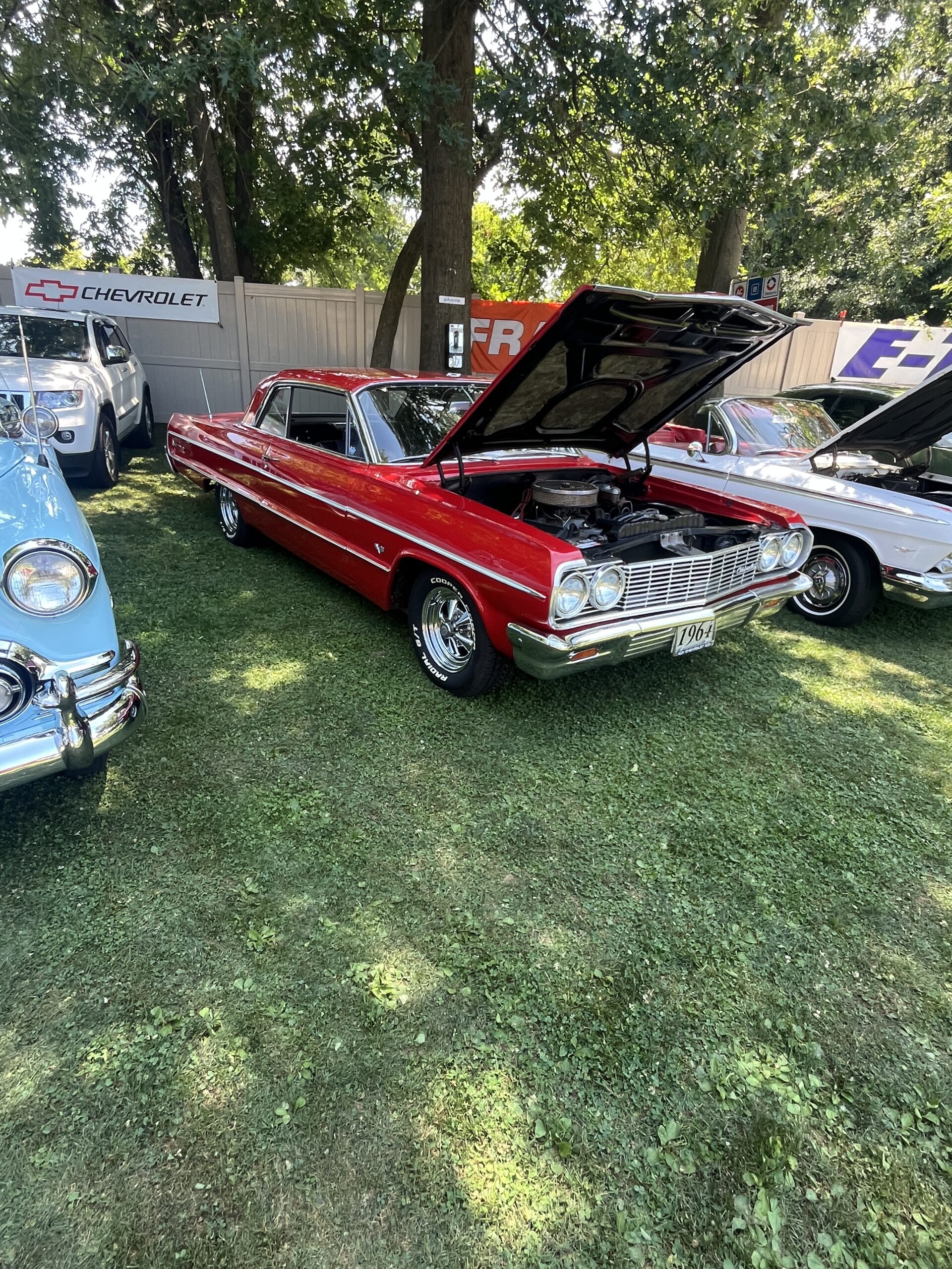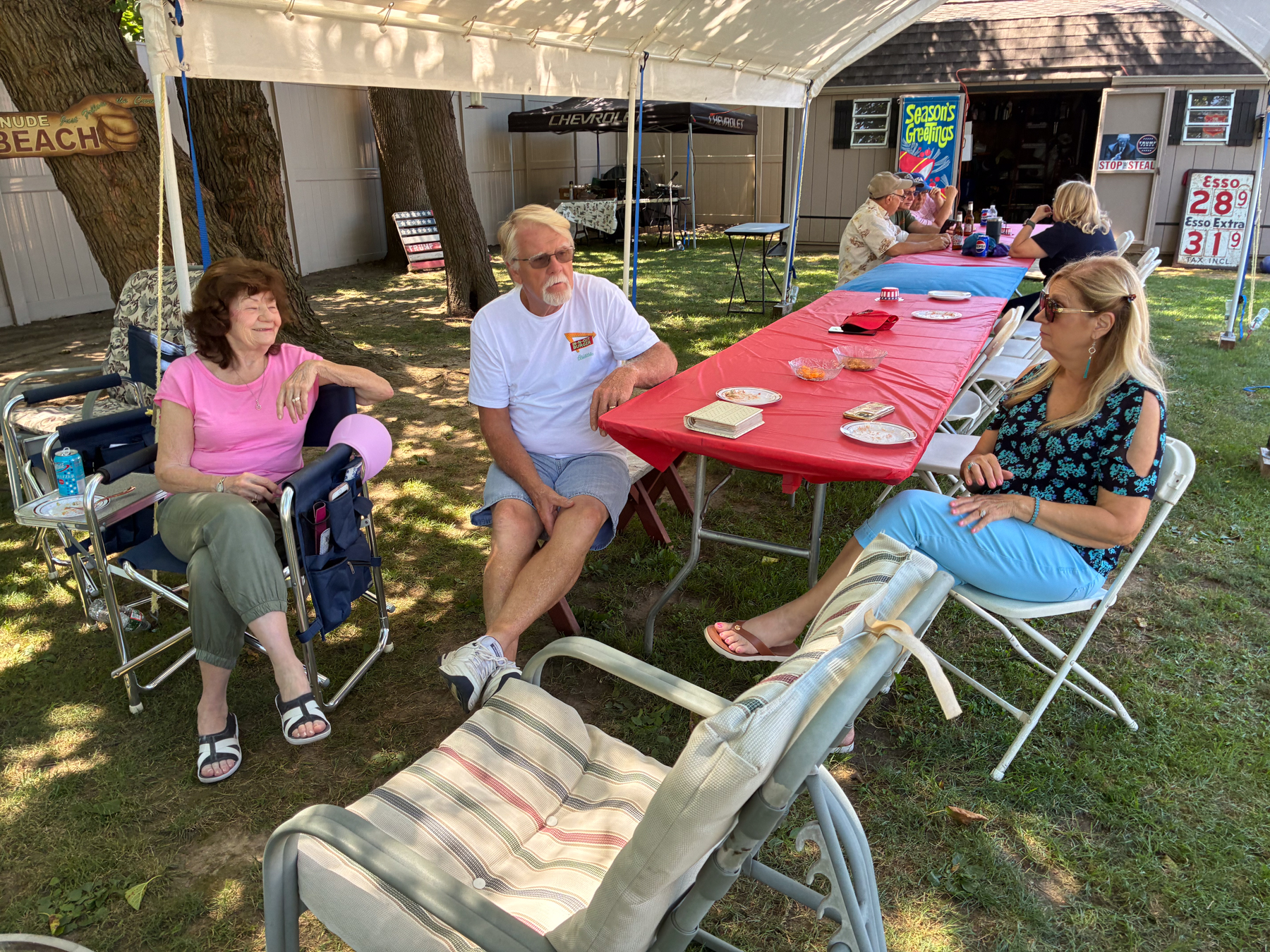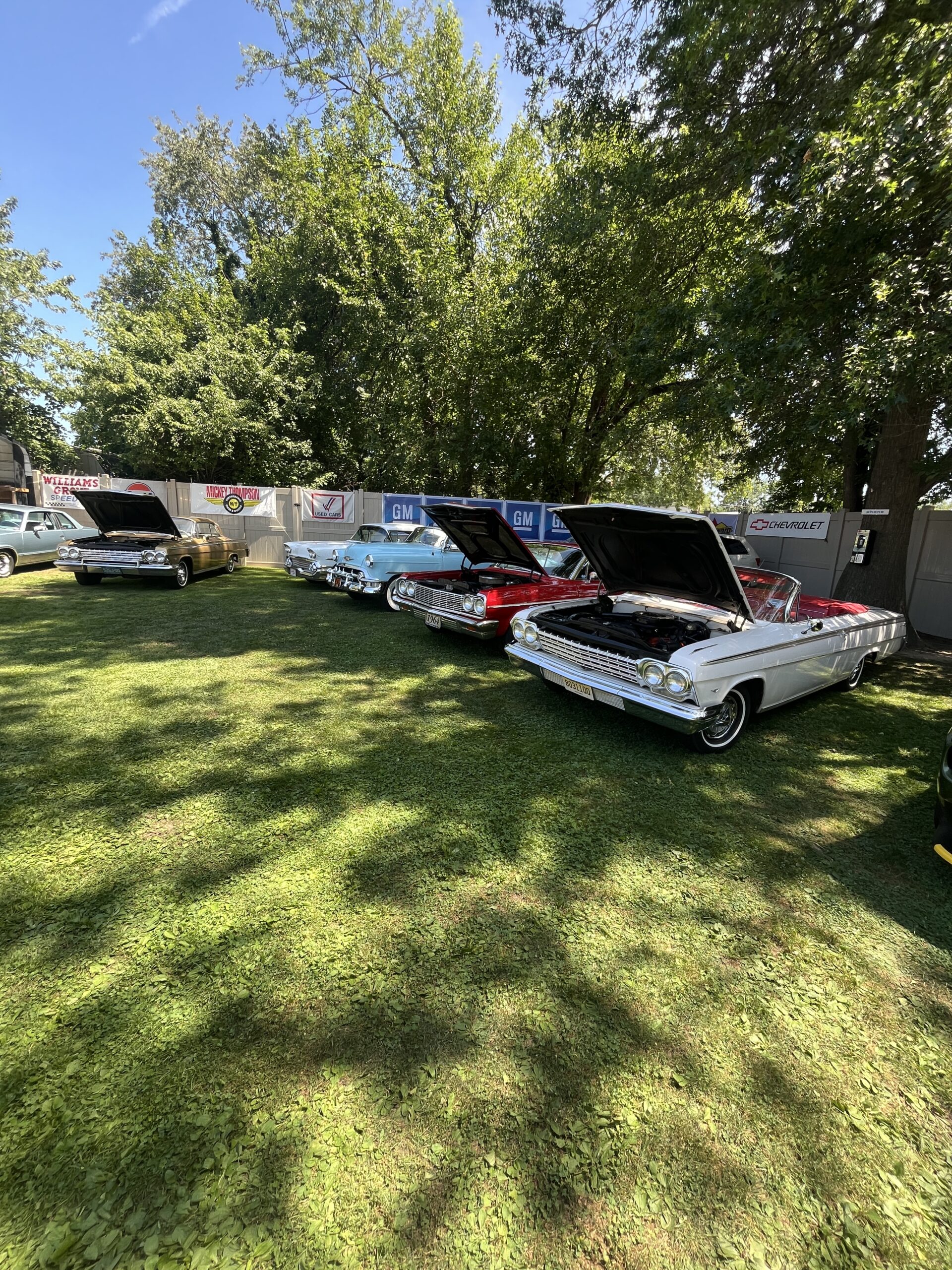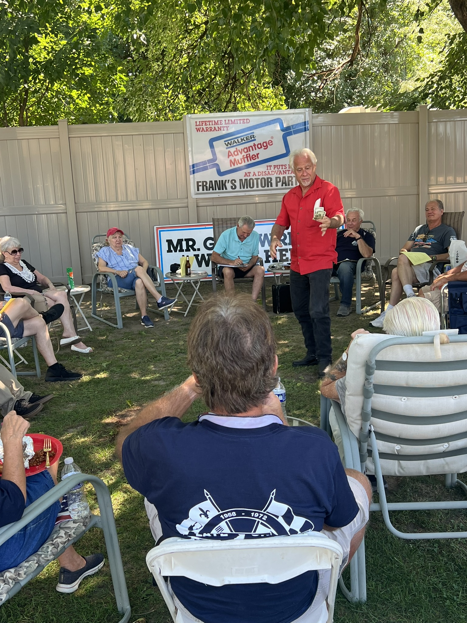The Dennery Picnic was the Event of the Year! If you missed this picnic, you missed a great day. Dawn and John put on a truly excellent event once again. Their yard was decked out with auto related signs everywhere. (I wonder where they all came from?) Our club was joined by members of the VCCA (Vintage Chevrolet Club of America) Several in attendance are members of both clubs. It was fun seeing a number of cars I hadn’t seen before. One in particular, a robin’s egg blue 1953 BelAir convertible was amazing. There was plenty of food and drink, our own Steve Calandra spinning records and singing, a pool, nice shady seating areas and toward the end of the day, the dessert bar! I would like to thank Jason Dennery for handling the grill duties. Good Job!